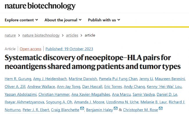 2023年10月19日,來自全球第二大生物技術(shù)公司Genentech的研究團(tuán)隊(duì),在Nature Biotechnology雜志上發(fā)表了一篇題為 Systematic discovery of neoepitope–HLA pairs for neoantigens shared among patients and tumor types的文章,他們發(fā)掘了86個(gè)具有免疫原性的候選新生抗原-HLA結(jié)合表位,本研究的相關(guān)數(shù)據(jù)將非常有助于研究人員推動(dòng)在抗原加工以及新抗原表位靶向治療方面的研究進(jìn)展。本研究使用了PEAKS Online軟件完成了對工程T細(xì)胞系的全免疫多肽組質(zhì)譜數(shù)據(jù)的準(zhǔn)確、無偏鑒定。