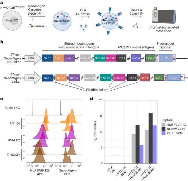 選擇HMy2.C1R (C1R) 淋巴母細(xì)胞,利用CRISPER-Cas9破壞其HLA-C等位基因(HLA-C*04:01),生成HLA-null細(xì)胞群,并通過FACS將目標(biāo)細(xì)胞群富集出來。隨后,通過穩(wěn)定的慢病毒轉(zhuǎn)導(dǎo)將15個(gè)HLA等位基因作為單個(gè)轉(zhuǎn)基因分別引入新抗原連接子表達(dá)和非連接子表達(dá)的C1R-HLAnull細(xì)胞系,最終共獲得30個(gè)細(xì)胞群。連接子和無連接子的新抗原工程細(xì)胞構(gòu)建時(shí)包含了一組相同的7個(gè)已知的HLA-A*02:01遞呈表位。并且,隨后的HLA-IP和靶向質(zhì)譜分析證實(shí)了連接子和非連接子HLA-A*02:01工程細(xì)胞中存在的兩種對照肽和前序報(bào)道的TP53 R175H23新抗原表位。