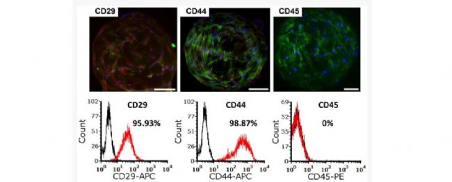 使用優(yōu)化后的參數(shù)在生物反應(yīng)器中動(dòng)態(tài)培養(yǎng),細(xì)胞更均勻。培養(yǎng)8天后收獲細(xì)胞微載體,免疫熒光染色研究bMSCs表面標(biāo)志物的表達(dá),其特異性表面標(biāo)記物對(duì)CD29和CD44呈陽(yáng)性,對(duì)CD45呈陰性,為進(jìn)一步驗(yàn)證這些結(jié)果,使用流式細(xì)胞術(shù)得到了相同的免疫表型(圖3)。特異的bMSC表面標(biāo)志物在擴(kuò)增后仍保持不變,表明基于微載體的擴(kuò)增培養(yǎng)沒(méi)有誘導(dǎo)干細(xì)胞發(fā)生變化。