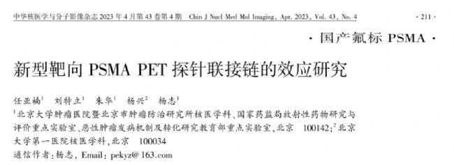 北京大學(xué)腫瘤醫(yī)院暨北京市腫瘤防治研究所,國家藥監(jiān)局放射性藥物研究與評價(jià)重點(diǎn)實(shí)驗(yàn)室,惡性腫瘤發(fā)病機(jī)制及轉(zhuǎn)化研究教育部重點(diǎn)實(shí)驗(yàn)室、北京大學(xué)第一醫(yī)院核醫(yī)學(xué)科團(tuán)隊(duì)的研究成果“新型靶向PSMA PET探針聯(lián)接鏈的效應(yīng)研究”在學(xué)術(shù)期刊《中華核醫(yī)學(xué)與分子影像雜志》發(fā)表。平生公司的小動物PET/CT(型號:Super Nova) 產(chǎn)品在論文中提供了重要的腫瘤小鼠PET/CT圖像和定量分析。