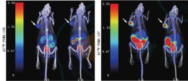 和Al18F-PSMA-137(B)后1和2h的Micro PET/CT現(xiàn)象圖(箭頭顯示腫瘤)。