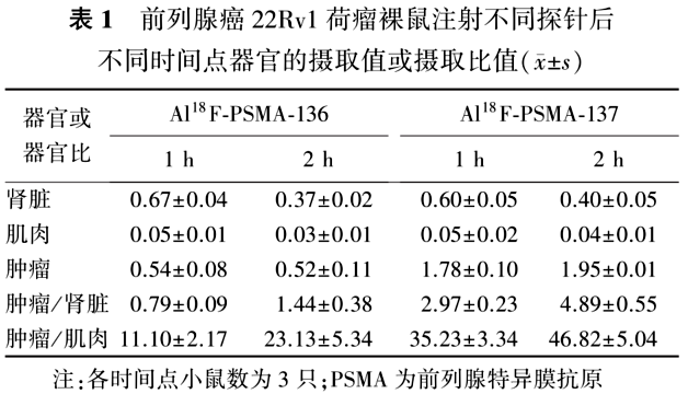 Al18F-PSMA-136在22Rv1模型鼠體內(nèi)的分布和Al18F-PSMA-137相似,主要濃聚在腎臟、腸道、膽囊、膀胱和腫瘤(圖2)。與 Al18F-PSMA-136 相比,Al18F-PSMA-137顯示出更好的腫瘤靶向性,2種探針注射后1、2h腫瘤部位的攝取值差異均有 統(tǒng)計(jì)學(xué)意義(t值:13.29、18.53,均P<0.001;表1);2種探針在腎臟和肌肉中 的攝取相當(dāng),但Al18F-PSMA-137具有更高的腫瘤/腎臟和腫瘤/肌肉比值(表1)。