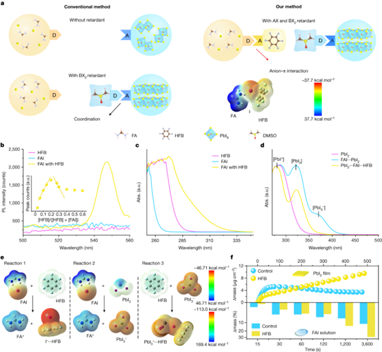 2在開始時(shí)質(zhì)量增加幅度更小,而且一直沒有達(dá)到飽和。此外,電感耦合等離子體發(fā)射光譜儀測量結(jié)果顯示,前30秒內(nèi),有3.6%的FAI在FAI/IPA溶液中消耗,而在FAI–HFB/IPA溶液中僅消耗1.2%的FAI(圖1f,下圖)。這些結(jié)果表明,HFB可以有效地延緩FAI和PbI