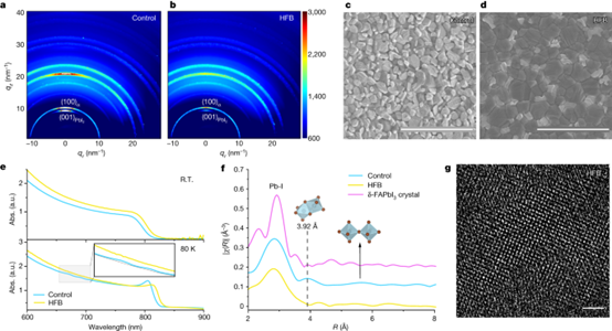 最終薄膜的變化可能源于結(jié)晶過程。通過 X 射線衍射(XRD)和 GIWAXS(圖 3a,b)測量,HFB 樣品顯示出更窄的α-FAPbI3 衍射峰。此外,從掃描電子顯微鏡(SEM)圖像(圖 3c、d)中可以清楚地觀察到,加入 HFB 后,晶粒尺寸從約 200 nm 增加到 1 μm 以上。此外,結(jié)果證實(shí)了在用傳統(tǒng)前驅(qū)體(FAPbI