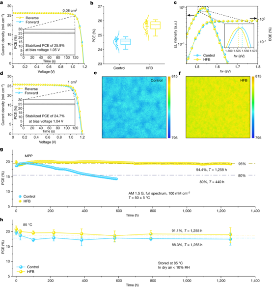 最佳 HFB 器件的正向掃描 PCE 為 26.07%,反向掃描 PCE 為 26.01%,平均 PCE 為 26.04%(圖 4a)。最佳穩(wěn)定功率輸出為 25.9%。對100 個(gè)帶或不帶 HFB 的器件進(jìn)行了統(tǒng)計(jì)分析。HFB的PCE平均達(dá)到 25.65%,而對照組為 24.53%(圖 4b)。根據(jù)外部量子效率和電致發(fā)光光譜(EQE-EQEEL)(圖 4c),HFB 樣品和對照樣品的開路電壓分別為 1.236 V 和 1.254 V,因此計(jì)算出每種樣品的非輻射 VOC 損失分別為 0.043 V 和 0.076 V。如圖 4g 所示,對照 PSC 的 PCE 在 600 小時(shí)后下降了 30%,而 HFB 器件在 1258 小時(shí)后仍保持了 94% 的初始效率。在 12 個(gè)器件中,對照 PSC 在 1255 小時(shí)后平均保持了 88.3% 的初始效率。使用 HFB 的器件在 12 個(gè)器件中平均保持了其初始效率的 91.8%。耐熱性增強(qiáng)的原因可能是 HFB 包鈦礦中的 MA 陽離子殘留減少。
