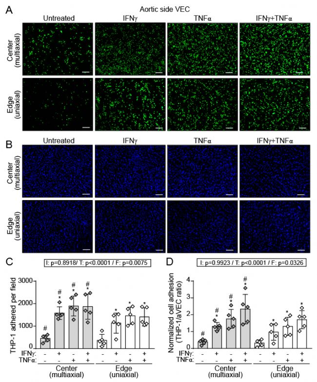 免疫細(xì)胞浸潤(rùn)是CAVD最早的事件之一。為了闡明這一過(guò)程,實(shí)驗(yàn)最后研究了多軸和單軸流動(dòng)模式對(duì)單核細(xì)胞粘附到瓣膜內(nèi)皮細(xì)胞的影響。結(jié)果表明,IFN-γ 和 TNF-α 增加了多軸和單軸剪切流下單核細(xì)胞對(duì)aVEC 的粘附(圖3 A-D)。值得注意的是,THP-1粘附的數(shù)量和 THP-1/VEC 比值顯示,與孔的邊緣(單軸)相比,中心(多軸)的粘附量明顯更高(圖3 D)。此外,TNF-α與IFN-γ聯(lián)合進(jìn)一步增強(qiáng)促粘附效應(yīng)(圖3 D)?傊,數(shù)據(jù)證明了IFN-γ和TNF-α對(duì)單核細(xì)胞粘附到aVEC單層的流動(dòng)特異性影響。