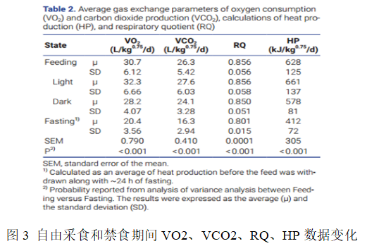 在適宜環(huán)境下,按照適應(yīng)期3d(自由采食和飲水),自由采食1d,禁食1d(移除飼料,自由飲水)的研究方法,測(cè)量O2消耗量、CO2產(chǎn)生量、產(chǎn)熱量(HP)、呼吸商(RQ)等數(shù)據(jù)。