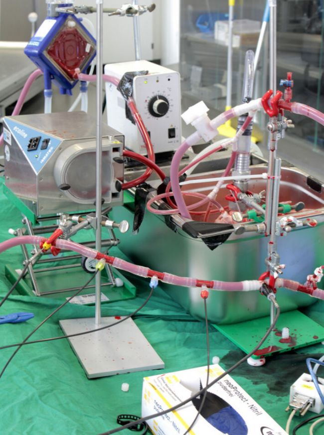該研究旨在調(diào)查這些并發(fā)癥的原因是否出現(xiàn)在血泵或氧合器本身中。因此,我們開發(fā)了一種醫(yī)用ECMO測(cè)試臺(tái),將隔離的灌注心臟作為血泵。在生理?xiàng)l件下,這種血泵不會(huì)造成任何損害。如果在這些實(shí)驗(yàn)條件下發(fā)生溶血和血液凝固增加,這很可能表明氧合器中的流動(dòng)情況不是最佳的。