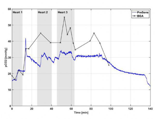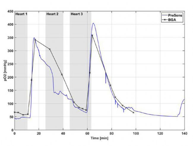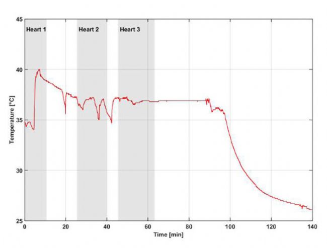 2018 年 7 月 23 日,PreSensFTC可以在三個(gè)心臟的測(cè)試臺(tái)上首次進(jìn)行測(cè)試(圖2)。所有三顆心臟都成功地用心臟I的相同血液A復(fù)活(見表2)。盡管只有很短的時(shí)間,但所有心臟都能成功復(fù)活的事實(shí)表明實(shí)驗(yàn)是成功的。