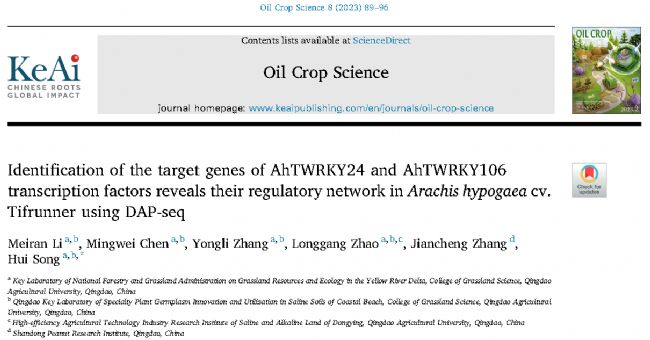 2023年6月4日,青島農(nóng)業(yè)大學(xué)草業(yè)學(xué)院宋輝教授課題組的研究成果,發(fā)表在Oil Crop Science期刊上,文章題目為Identification of the target genes of AhTWRKY24 and AhTWRKY106 transcription factors reveals their regulatory network in Arachis hypogaea cv. Tifrunner using DAP-seq。該研究使用DNA親和純化測序(DAP-seq)技術(shù)鑒定了AhTWRKY24和AhTWRKY106的結(jié)合基序以及下游基因。并結(jié)合RNA-seq數(shù)據(jù)揭示了AhTWRKY24和AhTWRKY106轉(zhuǎn)錄因子可以調(diào)控參與干旱脅迫響應(yīng)的下游基因。