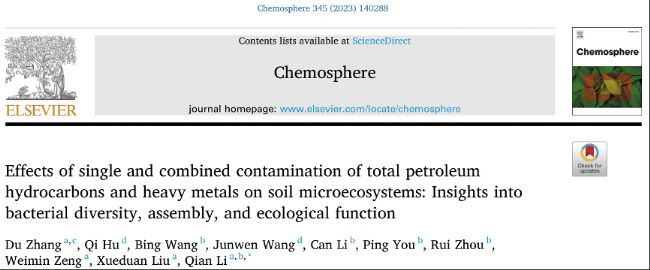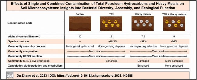 2023年9月30日,中南大學(xué)張杜博士為第一作者、李騫教授為通訊作者在《Chemosphere》雜志上發(fā)表題為“Effects of single and combined contamination of total petroleum hydrocarbons and heavy metals on soil microecosystems: Insights into bacterial diversity, assembly, and ecological function”的研究論文,該研究采用16S rRNA測序技術(shù),研究了總石油烴(total petroleum hydrocarbons,TPH)單一污染、重金屬單一污染以及總石油烴-重金屬復(fù)合污染的土壤微生物群落特征,并與相應(yīng)的低污染對照進(jìn)行比較。