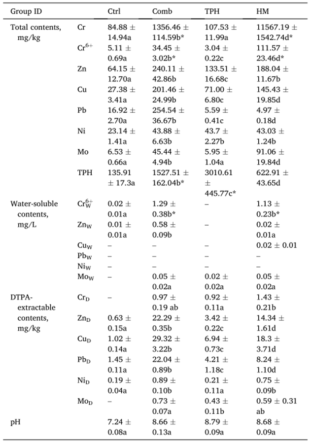 注:重金屬總量、水溶性含量、DTPA可提取量、TPH和pH值以平均值±SD(標(biāo)準(zhǔn)差)表示,n=3。一行中不同字母表明組間存在統(tǒng)計學(xué)顯著差異,p<0.05。污染物總量方面,星號(*)表示工業(yè)用地土壤環(huán)境質(zhì)量國家標(biāo)準(zhǔn)(GB36600-2018)(Cr6+、Cu、Pb、Ni、TPH)和湖南省標(biāo)準(zhǔn)(DB43/T165-2016)(Cr和Zn)中含量超過開發(fā)用地土壤污染風(fēng)險篩選值的污染物。對于水溶性含量,“#”是指含量超過GB14848-2017中IV類的污染物。“-”表示低于檢測限值。