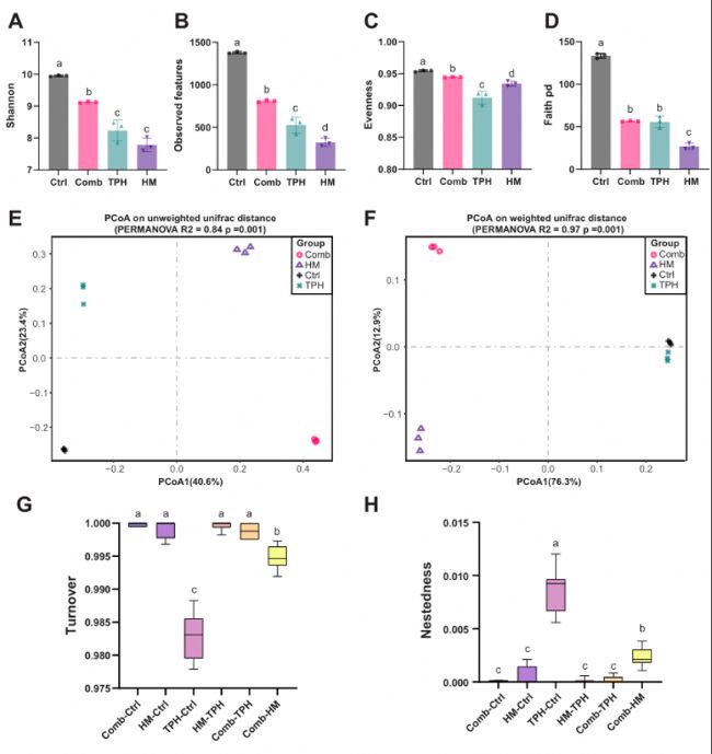 通過Mann-Whitney U檢驗分析組間的統(tǒng)計學(xué)顯著性。不同字母表明組間存在統(tǒng)計學(xué)上顯著差異,p<0.05。Ctrl:輕度污染對照;TPH:TPH污染嚴(yán)重的土壤;HM:重金屬污染嚴(yán)重的土壤;Comb,TPH和重金屬的復(fù)合污染。