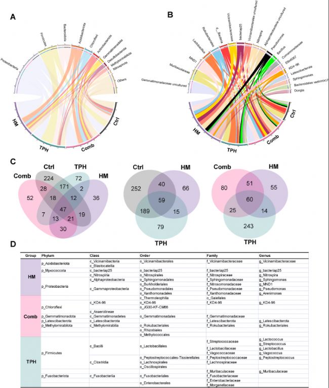 圖4:Ctrl組、TPH組、HM組和Comb組的微生物群分類組成差異。