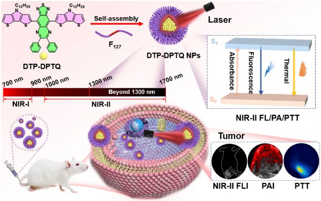 圖1. DTP-DPTQ的化學(xué)結(jié)構(gòu)、親水化處理以及近紅外II類(lèi)熒光/光聲雙模成像和光熱療法的示意圖