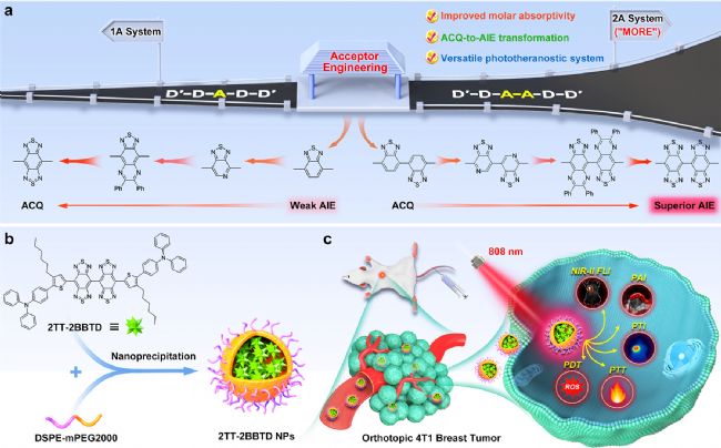 目前,電子供體的設計發(fā)展迅速,而電子受體工程的研究卻很少受到重視。受“多多益善”的思想啟發(fā),作者設計并研究了基于受體工程的兩個具有D′−D−A−D−D′(1A系統)和D′−D−A−A−D−D′(2A系統)結構的系統。通過這種方法,研究團隊成功地構建了具有AIE特性的近紅外熒光物質(圖1),這些物質在聚集態(tài)下具有較高的發(fā)光強度和較長的發(fā)光波長。這些物質可以用于多模式光熱診療,提高診療效果。
