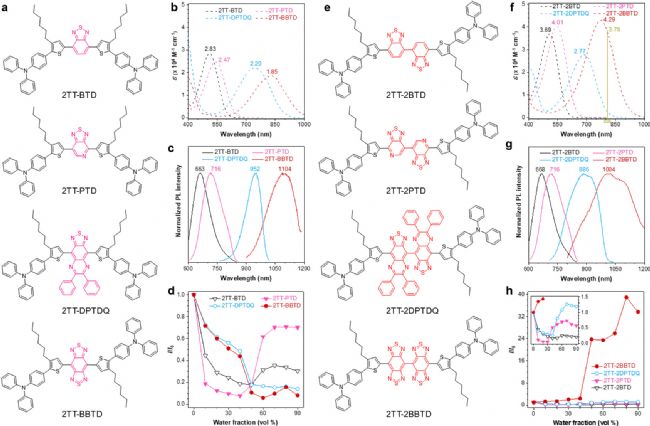 雙受體工程是指在分子結構中引入兩個受體單元,以增強分子的光物理性能。通過合理設計受體單元的結構和位置,可以調控分子的發(fā)光波長、量子產率和光穩(wěn)定性等性能。作者成功地合成了一系列具有第二近紅外發(fā)光特性的AIE物質,并對其光物理性能進行了詳細的表征。