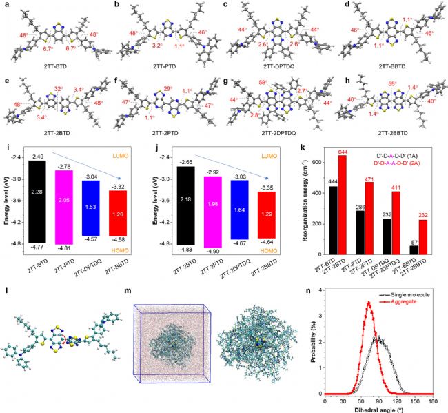 圖2. 1A和2A體系中所有化合物優(yōu)化后的幾何構型(a-h)及其相關數據(i-n)。