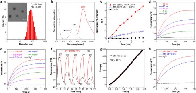 接著,考慮到化合物優(yōu)異的AIE特征和位于NIR-II區(qū)域的發(fā)射波長,使用兩親性共聚物DSPE-mPEG2000將疏水性2TT-2BBTD包封到NPs中,并進行DLS分析(圖3a)。由于其優(yōu)異的性質,2TT-2BBTD納米粒被選用于進一步的研究和應用。經測定,2TT-2BBTD NPs分別在799和1065 nm處顯示出最大吸收和發(fā)射(圖3b)。此外,作者評價了2TT-2BBTD NPs的ROS產生和光熱轉化能力(圖3c),證實了2TT-2BBTD NPs具有NPs濃度和激光功率密度依賴性溫度升高的特性(圖3d,e)。這些結果表明,2TT-2BBTD NPs 的發(fā)熱量可以輕松控制。