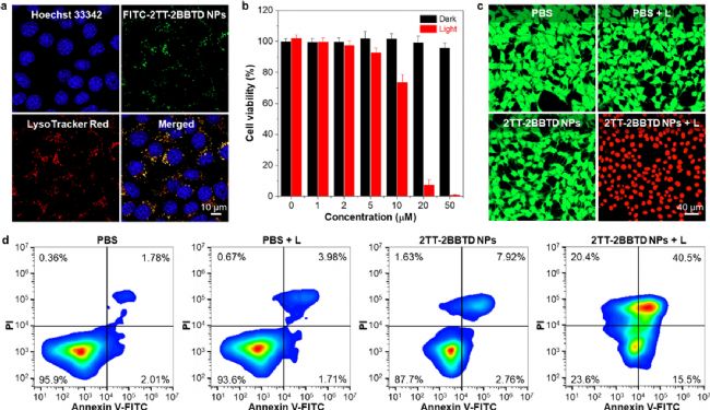 圖4. (a)用Hoechst 33342、FITC-2TT-2BBTD NPs和LysoTracker Red染色后的4T1細胞的CLSM圖像。(b)在黑暗或808 nm激光照射下用不同濃度的2TT-2BBTD NPs處理后的4T1細胞的細胞活力。(c)各種處理后4T1細胞的活細胞和死細胞染色。綠色和紅色熒光分別表示活細胞和死細胞。(d)用PBS和2TT-2BBTD NPs處理的4T1細胞的流式細胞術分析。