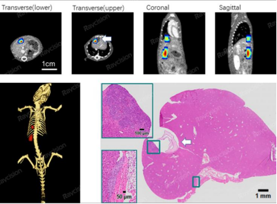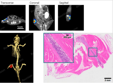 Micro-CT和BLT(生物發(fā)光斷層掃描)多模態(tài)成像顯示右肝近腔處有一個腫瘤,組織學(xué)分析證實了這一點。特別值得注意的是,多模態(tài)成像系統(tǒng)可以捕獲罕見的癌癥轉(zhuǎn)移。形成腫瘤骨轉(zhuǎn)移是前列腺癌終末期的特點,在該研究中,作者發(fā)現(xiàn)小鼠右脛骨處有一個腫瘤腫塊,與組織學(xué)驗證結(jié)果一致。