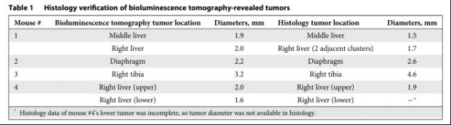 在二維光學(xué)成像中,由于缺乏深度信息,動物表面的生物發(fā)光強度不能反映腫瘤的病灶,而三維BLT圖像能夠直接量化腫瘤的大小。作者通過BLT圖像測量腫瘤直徑(腫瘤內(nèi)任意兩點之間的最大距離),并與組織學(xué)結(jié)果進(jìn)行對比。結(jié)果顯示,BLT測量的腫瘤直徑與組織學(xué)測量的腫瘤直徑在同一量級。