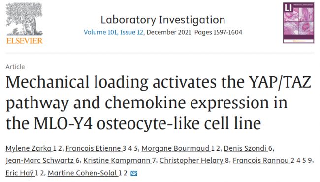 鑒于這些發(fā)現(xiàn),已經(jīng)提出了YAP/TAZ在骨細(xì)胞中的潛在作用的問題,特別是在響應(yīng)3D機(jī)械負(fù)荷時(shí)。因此,在法國(guó)巴黎拉里布瓦西埃醫(yī)院、巴黎大學(xué)健康學(xué)院及英國(guó)曼徹斯特曼徹斯特大學(xué)生物科學(xué)學(xué)院聯(lián)合研究的一項(xiàng)實(shí)驗(yàn)中利用了一種新的承受壓縮應(yīng)力的3D培養(yǎng)模型來表征骨細(xì)胞樣細(xì)胞系MLO-Y4在機(jī)械負(fù)荷下的反應(yīng)。相關(guān)內(nèi)容發(fā)表在 Laboratory Investigation 期刊題為“Mechanical loading activates the YAP/TAZ pathway and chemokine expression in the MLO-Y4 osteocyte-like cell line”。