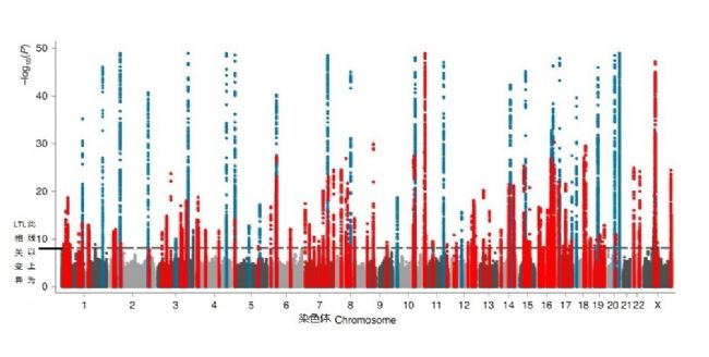 遺傳相關(guān)位點(diǎn):這項(xiàng)研究對(duì)50萬(wàn)人端粒長(zhǎng)度和2千萬(wàn)變異位點(diǎn),進(jìn)行了全基因組關(guān)聯(lián)分析,發(fā)現(xiàn)了197個(gè)變異與白細(xì)胞端粒長(zhǎng)度(LTL)相關(guān)。