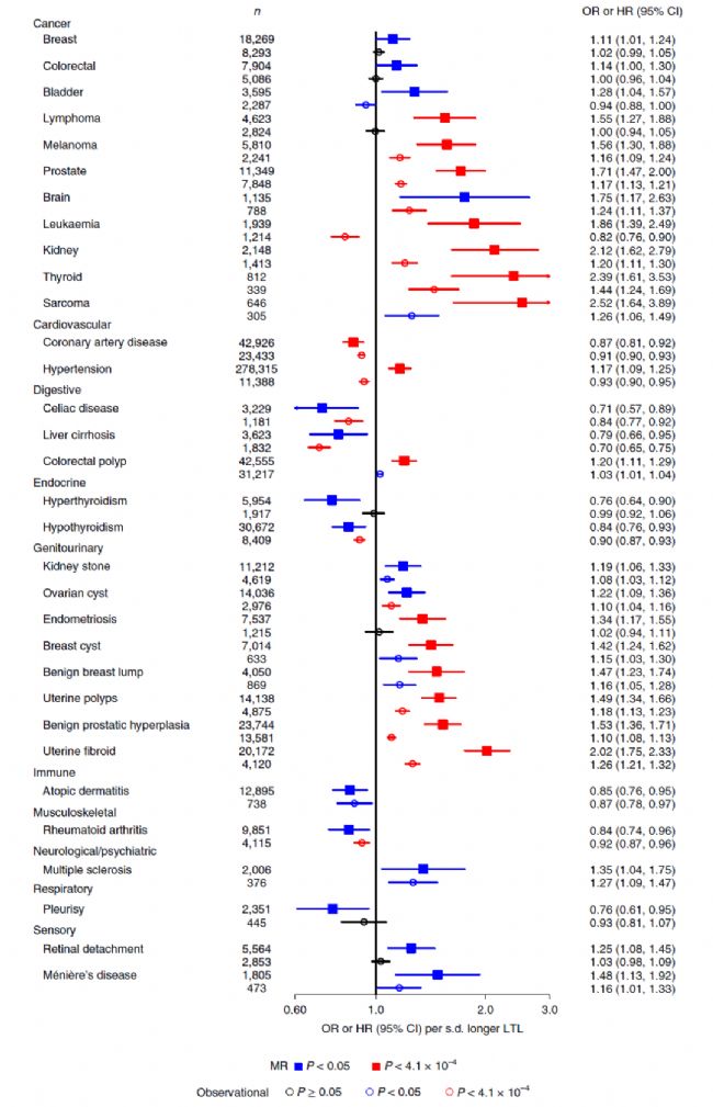 生物醫(yī)學(xué)性狀: 通過(guò)孟德爾隨機(jī)分析,作者發(fā)現(xiàn)了16種疾病與白細(xì)胞端粒長(zhǎng)度(LTL)的遺傳決定有關(guān)。