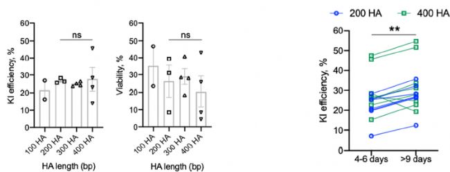 通常KO不會(huì)對(duì)細(xì)胞的活率產(chǎn)生太大影響,但是對(duì)于KI,需要用到donor DNA,如dsDNA,或者使用更強(qiáng)的電轉(zhuǎn)染條件,這些可能會(huì)導(dǎo)致活率的負(fù)面影響。