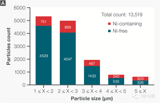 在本案例中,程序設(shè)定掃描了 3mm² 區(qū)域、識別尺寸大于 1μm 的顆粒。其中,具有含鎳量超過 15% 的顆粒被分類為“富鎳相”。Perception Reporter 軟件允許用戶輕松創(chuàng)建定制的顆粒表、直方圖或三元圖。