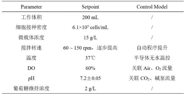 使用T&J CloudReady™(500 mL)云平臺(tái)平行生物反應(yīng)器(圖2)進(jìn)行Vero細(xì)胞的培養(yǎng)。槳葉為雙斜葉槳,攪拌方向?yàn)橄聣菏健9嗔餮b置安裝于生物反應(yīng)器內(nèi)部,通過(guò)管路與外部進(jìn)、出液瓶連接。實(shí)驗(yàn)工藝參數(shù)設(shè)置如表1所示,在完整的培養(yǎng)周期中,各參數(shù)控制均可靠且穩(wěn)定(圖3)