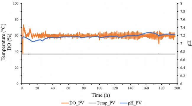 圖3 培養(yǎng)過(guò)程中溫度、pH、DO參數(shù)控制穩(wěn)定性