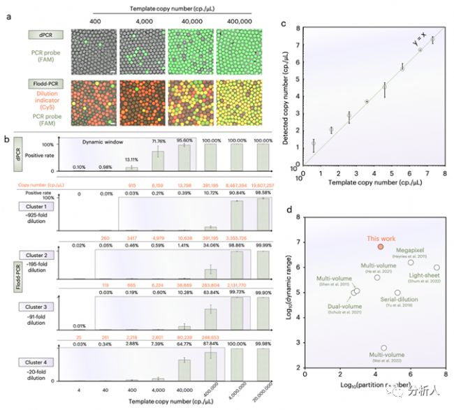 接下來,研究團(tuán)隊(duì)通過一系列實(shí)驗(yàn)表征了 Flodd-PCR 的實(shí)際動(dòng)態(tài)范圍,如圖 3 所示。實(shí)驗(yàn)結(jié)果表明常規(guī) dPCR 的動(dòng)態(tài)范圍僅為 4~40,000 拷貝/µL,而 Flood-PCR 得益于連續(xù)梯度稀釋的功能,能夠?qū)z測動(dòng)態(tài)范圍擴(kuò)寬到 4~20,000,000 拷貝/µL。此外,團(tuán)隊(duì)還將 Flodd-PCR 和其他的代表性高動(dòng)態(tài)范圍 dPCR 方法進(jìn)行了橫向比較,結(jié)果表明 Flodd-PCR 在實(shí)現(xiàn)超高動(dòng)態(tài)范圍的同時(shí)并沒有增加液滴的數(shù)量,這意味著 Flodd-PCR 的液滴讀取和傳統(tǒng) dPCR 一樣簡便。