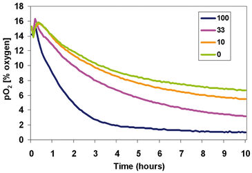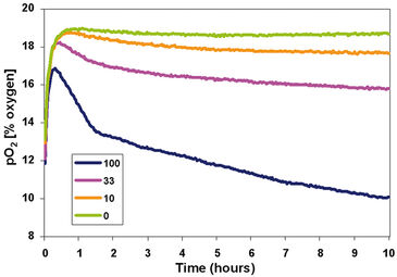 第一個實驗旨在研究細胞密度對細胞耗氧率和隨后培養(yǎng)基中pO2水平的影響。MEF細胞以三種不同的濃度(100,000;33,000;和10,000個細胞/cm2)以及“僅介質(zhì)”控制。在接近大氣中的氧氣水平(約為19% O2)下,每2分鐘測量一次,持續(xù)10小時。氧分布(圖2)清楚地顯示了細胞密度對每個處理的氧消耗水平的影響。觀察到的滯后時間< 1小時,推測系統(tǒng)正在與溫度和氧氣水平平衡。在此之后,所有細胞濃度都顯示出與“僅培養(yǎng)基”對照孔相比pO2水平的下降。最后,在孵育過程中,與“僅培養(yǎng)基”控制孔的偏差與最初接種的細胞數(shù)量成正比,這意味著個體細胞呼吸在所有測試的細胞密度下都是等效的。