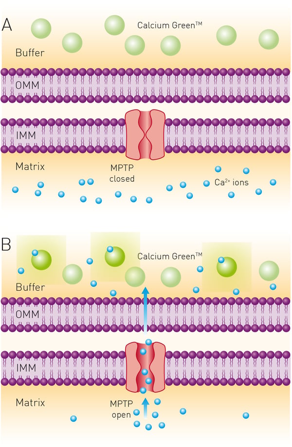 Fig. 4: Principle of calcium retention assay. The membrane-impermeable Calcium Green reports on extra-mitochondrial Ca2+