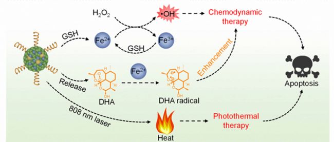 本文要點(diǎn):化學(xué)動(dòng)力療法(CDT)因其對(duì)腫瘤的高特異性和低副作用而受到越來(lái)越多的關(guān)注。然而,腫瘤細(xì)胞內(nèi)反應(yīng)性氧化物種(ROS)的絕對(duì)濃度較低限制了CDT的有效性。在本研究中,我們使用雙氫青蒿素(DHA)來(lái)增強(qiáng)CDT的效果,并結(jié)合光熱療法(PTT)以進(jìn)一步提高抗癌效果。本研究為開(kāi)發(fā)一種近紅外二區(qū)熒光成像引導(dǎo)增強(qiáng)的化學(xué)動(dòng)力學(xué)/光熱聯(lián)合治療納米平臺(tái)提供了高效途徑。