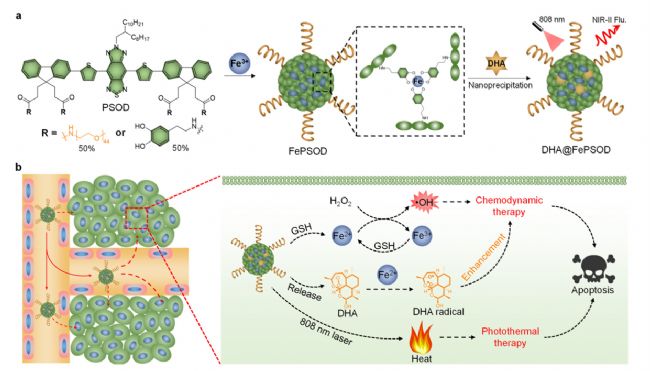 DHA@FePSOD是通過(guò)將DHA加載到鐵螯合的近紅外二區(qū)熒光半導(dǎo)體寡聚物(SO)納米顆粒(FePSOD)中制備的,F(xiàn)ePSOD是通過(guò)將鐵離子(Fe3+)與聚乙二醇(PEG)和多巴胺接枝的SO(PSOD)螯合而成。PSOD上的PEG鏈穩(wěn)定了交聯(lián)的納米顆粒,并使其具有水溶性,而多巴胺部分螯合Fe3+以形成納米顆粒(如圖1(a)所示)。在循環(huán)過(guò)程中,DHA@FePSOD可以通過(guò)被動(dòng)靶向在腫瘤部位積聚。腫瘤細(xì)胞內(nèi)過(guò)表達(dá)的谷胱甘肽(GSH)進(jìn)一步將Fe3+還原為Fe2+,催化H2O2的分解產(chǎn)生·OH進(jìn)行CDT。另一方面,F(xiàn)e2+可能將從納米顆粒釋放的DHA轉(zhuǎn)化為DHA自由基以增強(qiáng)CDT的效果。在808納米激光照射下,DHA@FePSOD不僅可以發(fā)射用于腫瘤成像的近紅外二區(qū)熒光信號(hào),還可以產(chǎn)生用于PTT的熱量。DHA@FePSOD引發(fā)的CDT和PTT最終導(dǎo)致癌細(xì)胞凋亡(如圖1(b)所示)。因此,DHA@FePSOD是一種對(duì)腫瘤微環(huán)境響應(yīng)的納米治療診斷學(xué),提供了高效的近紅外二區(qū)熒光成像引導(dǎo)增強(qiáng)的化學(xué)動(dòng)力學(xué)/光熱聯(lián)合治療。