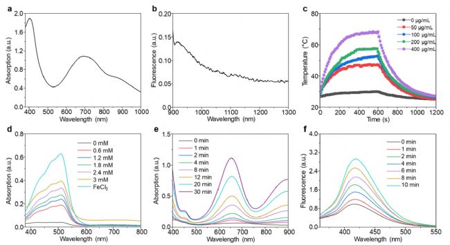 對(duì)于FePSOD和DHA@FePSOD,它們的吸收光譜幾乎與PSOD相同,而熒光強(qiáng)度比PSOD要弱(圖3(a))。這種現(xiàn)象可能歸因于FePSOD和DHA@FePSOD中SO主干的聚集。然而,無(wú)論是FePSOD還是DHA@FePSOD的熒光發(fā)射波長(zhǎng)都長(zhǎng)于1000納米,表明它們具有近紅外二區(qū)熒光成像的能力(圖3(b))。在808納米激光照射下,隨著樣品濃度的增加,F(xiàn)ePSOD和DHA@FePSOD的最高光熱溫度逐漸增加(圖3(c))。在GSH處理下,利用1,10-鄰菲啰啉作為指示劑確定了Fe2+的生成。對(duì)于經(jīng)過(guò)1,10-鄰菲啰啉孵育的FePSOD和DHA@FePSOD,500納米處的吸收隨著GSH濃度的增加急劇增加(圖3(d))。對(duì)于FePSOD和DHA@FePSOD,TMB在650和900納米處的吸收逐漸增加(圖3(e))。1,4-二羧基苯在420納米處熒光強(qiáng)度的增強(qiáng)進(jìn)一步證明了這兩種納米顆粒在H2O2和GSH作用下產(chǎn)生羥基自由基的能力(圖3(f))。