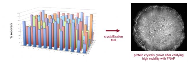 FRAP 能夠自動分析 96 孔 LCP 板以確定每個液滴的遷移率。每個孔都通過聚焦的激光點進行光漂白,并測量固定時間點后的熒光恢復。而在液滴中可遷移的蛋白質百分比表明是否可能發(fā)生結晶。