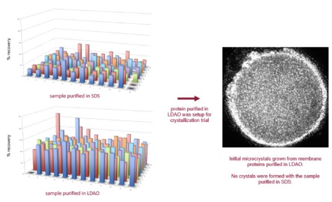 我們使用兩種不同的去污劑對一個完整的膜蛋白進行純化,因此在廣泛的結晶條件下 FRAP 熒光恢復存在顯著差異。這里 LDAO 被證明是一種更適合純化的去污劑,應該用于結晶試驗。如果在 SDS 中純化的蛋白質幾乎沒有遷移率,那么它就不會結晶。