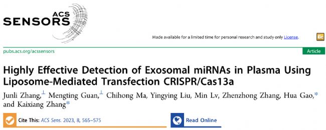 在上圖中的這項(xiàng)最新研究中,研究團(tuán)隊(duì)開發(fā)出一種新方法來(lái)檢測(cè)微量的癌癥相關(guān)的外泌體miRNA。該檢測(cè)方法基于CRISPR-Cas13a系統(tǒng),該系統(tǒng)具有獨(dú)特的RNA酶活性,而且靈敏、可靠和有效。研究團(tuán)隊(duì)先設(shè)計(jì)了一個(gè)CRISPR-Cas13a系統(tǒng)來(lái)切割熒光基團(tuán)和淬滅劑標(biāo)記的報(bào)告分子,然后將其包裝到脂質(zhì)體中,這一脂質(zhì)體相當(dāng)于人造版外泌體,再使用脂質(zhì)體介導(dǎo)的膜融合(MFS)策略,將CRISPR-Cas13a系統(tǒng)轉(zhuǎn)染到外泌體中。由于Cas13a具有獨(dú)特的RNA酶(RNase)活性,RNA引導(dǎo)下Cas13a的反式切割活性可以裂解熒光團(tuán)和淬滅劑標(biāo)記的報(bào)告細(xì)胞,導(dǎo)致靶標(biāo)RNA觸發(fā)RNA酶激活后熒光增強(qiáng)。當(dāng)脂質(zhì)體和外泌體融合在一起時(shí),如果外泌體中存在靶標(biāo)miRNA序列,CRISPR-Cas13a就會(huì)識(shí)別并結(jié)合到靶標(biāo)miRNA,然后激活反式切割活性,有效切割并產(chǎn)生放大的熒光信號(hào)。