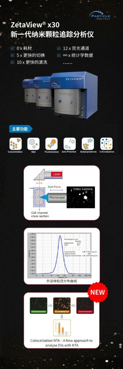 △ 作為目前最新款的NTA產(chǎn)品,ZetaView不僅能實(shí)現(xiàn)傳統(tǒng)NTA技術(shù)對(duì)納米顆粒粒徑和濃度的表征,還能測(cè)定樣品在特定條件下的Zeta電位,為樣品穩(wěn)定性和表面修飾結(jié)果提供可靠的數(shù)據(jù)支持。在熒光標(biāo)記實(shí)驗(yàn)中,ZetaView不僅能實(shí)現(xiàn)傳統(tǒng)NTA技術(shù)對(duì)某個(gè)標(biāo)志物的表征,還能通過(guò)配備雙激光或四激光,在單次進(jìn)樣中,同時(shí)完成多個(gè)標(biāo)志物的鑒定,并提供可靠的共定位(Colocalization)檢測(cè)結(jié)果,幫助用戶更全面地了解標(biāo)志物表達(dá)情況,助力用戶深度挖掘更多的標(biāo)志物信息。