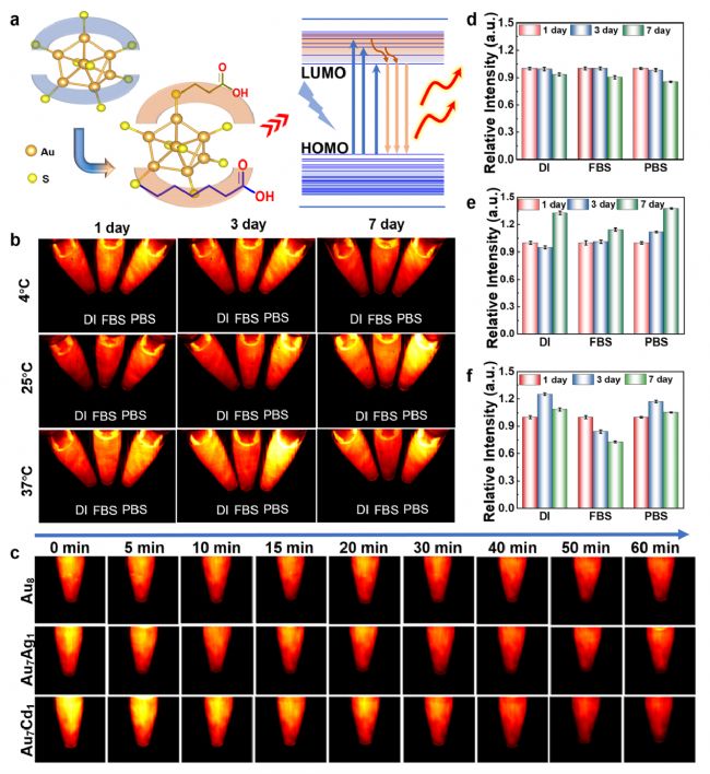 圖5討論了對金納米團(tuán)簇的光穩(wěn)定性進(jìn)行的測試以及其在生物成像中的應(yīng)用。研究發(fā)現(xiàn),金納米團(tuán)簇在復(fù)雜的生理環(huán)境下保持了良好的活性和穩(wěn)定性。形成離散的電子能級和在導(dǎo)帶內(nèi)的弛豫過程使得金納米團(tuán)簇具有長時間穩(wěn)定的光致發(fā)光特性。實(shí)驗(yàn)結(jié)果表明,在不同溶劑和溫度條件下培養(yǎng)一周后,其近紅外熒光強(qiáng)度幾乎沒有下降。此外,金納米團(tuán)簇在808 nm激光照射下表現(xiàn)出良好的光穩(wěn)定性,也在PBS溶液中連續(xù)激發(fā)60分鐘后仍保持可接受的衰減。