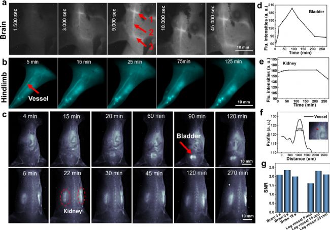 圖6討論了對金納米團(tuán)簇在活體內(nèi)的成像研究。它指出了血管結(jié)構(gòu)和功能異?赡軐(dǎo)致的疾病,并強(qiáng)調(diào)了對血管疾病的準(zhǔn)確診斷和實(shí)時監(jiān)測的重要性。通過使用NIR-II成像技術(shù),可以提供高分辨率、深層組織穿透的病理信息,對于疾病的診斷和監(jiān)測具有潛在價(jià)值。研究發(fā)現(xiàn),特定類型的金納米團(tuán)簇在腦血管和四肢血管成像方面表現(xiàn)出色,同時在全身血管成像方面也有優(yōu)異表現(xiàn)。這些結(jié)果展示了該納米團(tuán)簇在NIR-II成像領(lǐng)域的潛在應(yīng)用前景。