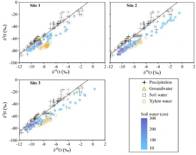 穩(wěn)定同位素已被廣泛應(yīng)用于根系水分吸收(RWU)的鑒定,通過將潛在水源分類為不同的端元,并評估其對木質(zhì)部水分的貢獻(xiàn)。然而,估計(jì)端元(主要是土層)的貢獻(xiàn)通常僅基于土壤水同位素的變化。土壤有效水分和根系分布是RWU的關(guān)鍵限制因子,但在水源分配中很少考慮。