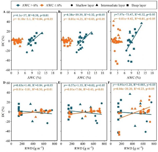 圖5 基于SIAR(A和D)、simmr(B和E)和MixSIAR(C和F)模型,平均貢獻(xiàn)和加權(quán)貢獻(xiàn)(DC)之間的差異與AWC(上圖)和RWD(下圖)之間的關(guān)系。