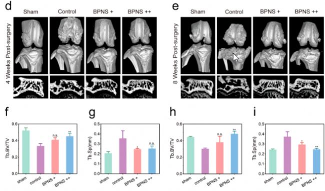BPNSs在體內(nèi)減弱OA進(jìn)展. (d,e)不同處理大鼠膝關(guān)節(jié)在第4周和第8周的代表性三維重建圖像(上排)和不同組大鼠脛骨內(nèi)側(cè)平臺(tái)的冠狀位微CT圖像(下排)。(f−i)。術(shù)后4周(f,g)和8周(h,i)顯微CT測(cè)量BV/TV和Tb.Sp。假手術(shù)組代表正常膝關(guān)節(jié),對(duì)照組代表ACLT誘導(dǎo)的OA膝關(guān)節(jié),給予生理鹽水處理。BPNS+組和BPNS++組分別代表10和50μg/mL BPNS處理后ACLT誘導(dǎo)的OA膝關(guān)節(jié)。所有數(shù)據(jù)均以均數(shù)±標(biāo)準(zhǔn)差(SD)表示。* p < 0.05, ** p < 0.01, *** p < 0.001。