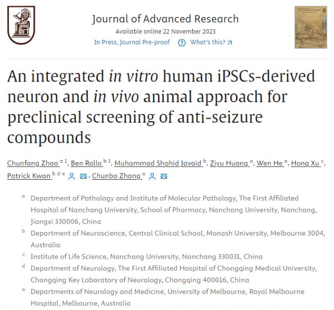 近日,南昌大學(xué)藥學(xué)院張春波團(tuán)隊(duì)和Monash University神經(jīng)科學(xué)系Patrick Kwan團(tuán)隊(duì)在Journal of Advanced Research(IF=10.7)上發(fā)表了題為“An integrated in vitro human iPSCs-derived neuron and in vivo animal approach for preclinical screening of anti-seizure compounds”的研究論文,建立了整合體外人源誘導(dǎo)性多能干細(xì)胞(induced pluripotent stem cells, iPSCs)誘導(dǎo)神經(jīng)元和體內(nèi)動(dòng)物模型進(jìn)行抗癲癇藥物開發(fā)的新方法,該方法具有保留人類基因遺傳背景和高通量篩選的優(yōu)勢,打破了傳統(tǒng)抗癲癇藥物開發(fā)過程中的物種影響和成本禁錮,有望提高藥物的篩選效率和成功率,通過該方法,研究者從14種天然化合物中鑒定出多種具有抗癲癇效果的化合物。南昌大學(xué)藥學(xué)院張春波教授和Monash University神經(jīng)科學(xué)系Patrick Kwan教授為論文共同通訊作者,南昌大學(xué)藥學(xué)院博士研究生趙春芳和Monash University神經(jīng)科學(xué)系研究員Ben Rollo博士為論文共同第一作者。