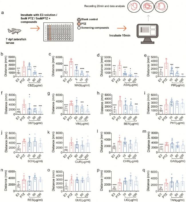 圖4 天然化合物在斑馬魚癲癇模型中的抗癲癇效果